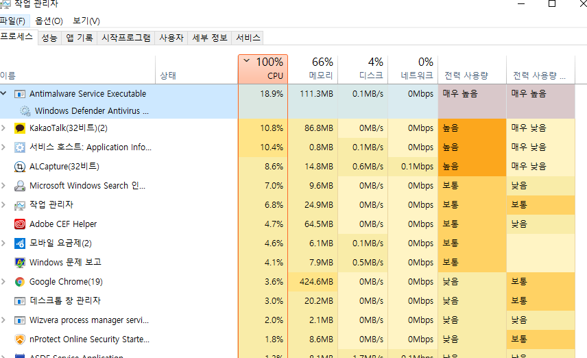 윈도우10 CPU 100% 를 찍으면 딜레이가 생기기 때문에