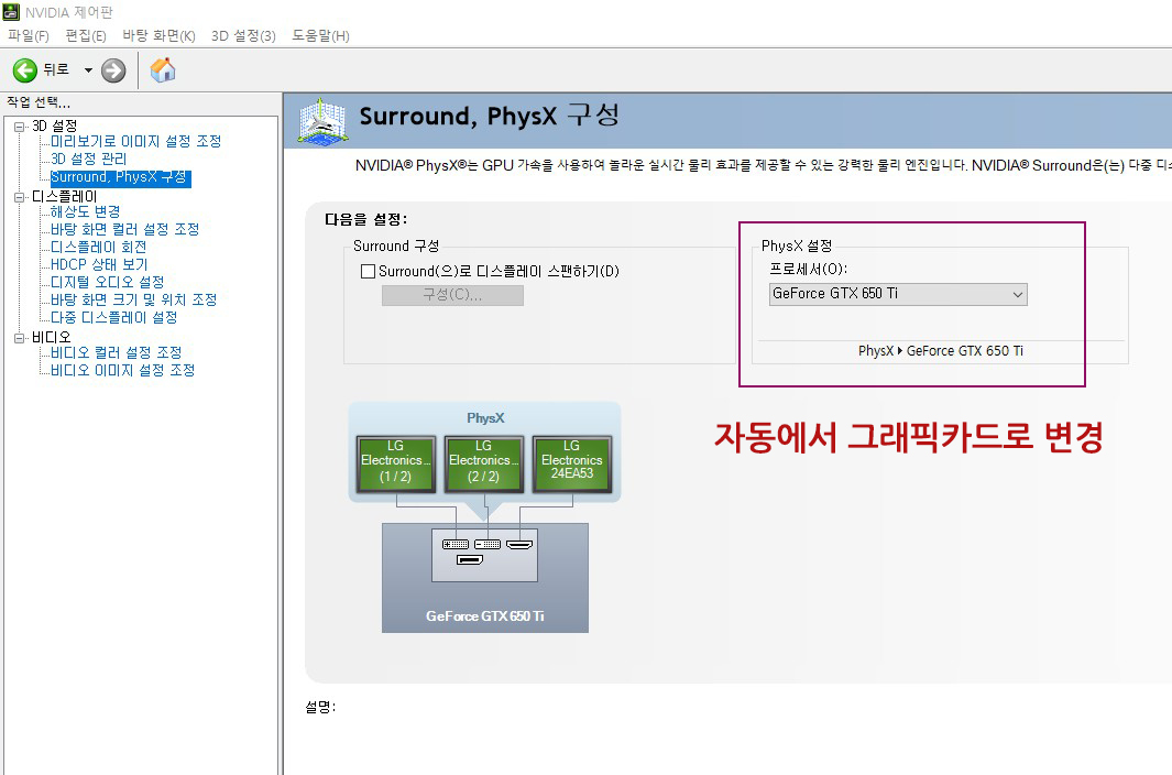 PHYSX 옵션의 프로세서가 자동으로 되어있는데, 사용하는 그래픽카드로 선택한 후
