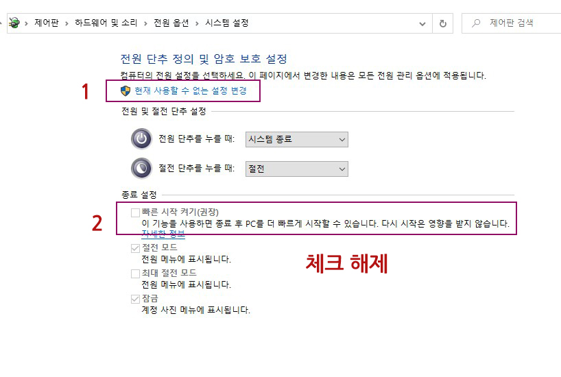 2번, 빠른 시작 켜기 옵션의 체크박스를 해제한다.