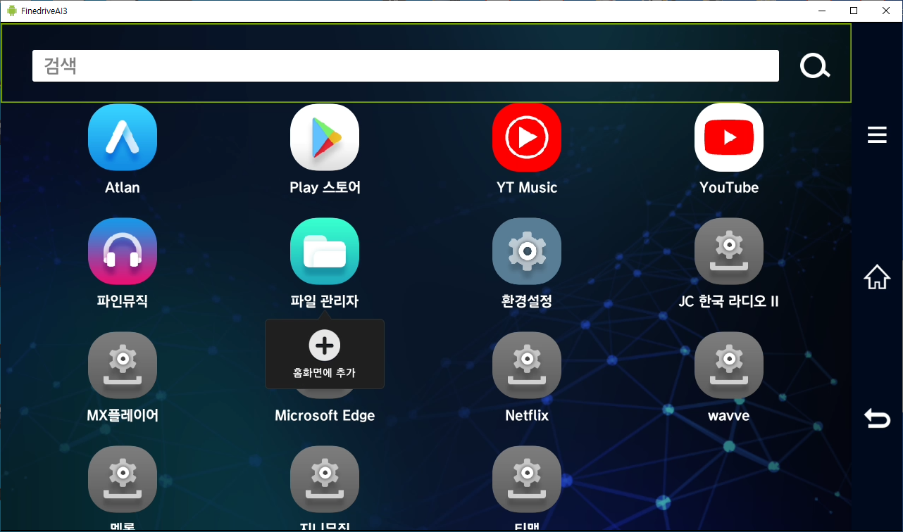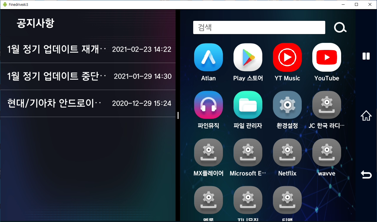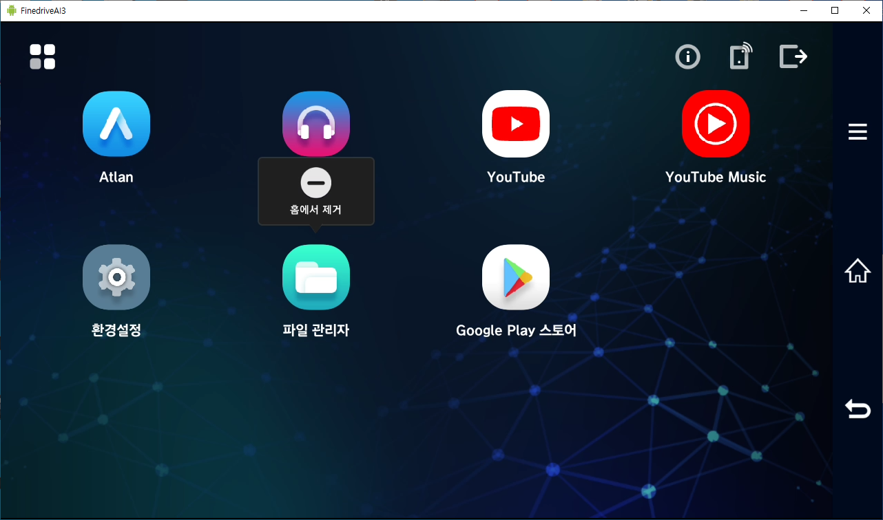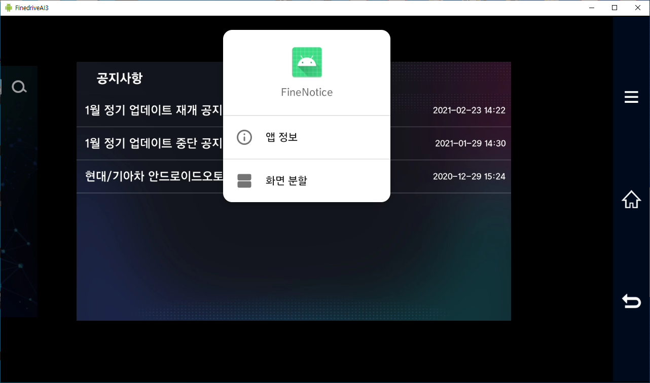 파인드라이브 AI3는 오른쪽 네비게이션바의 = 를 터치를 하면 아래와 같은 화면이 나옵니다.