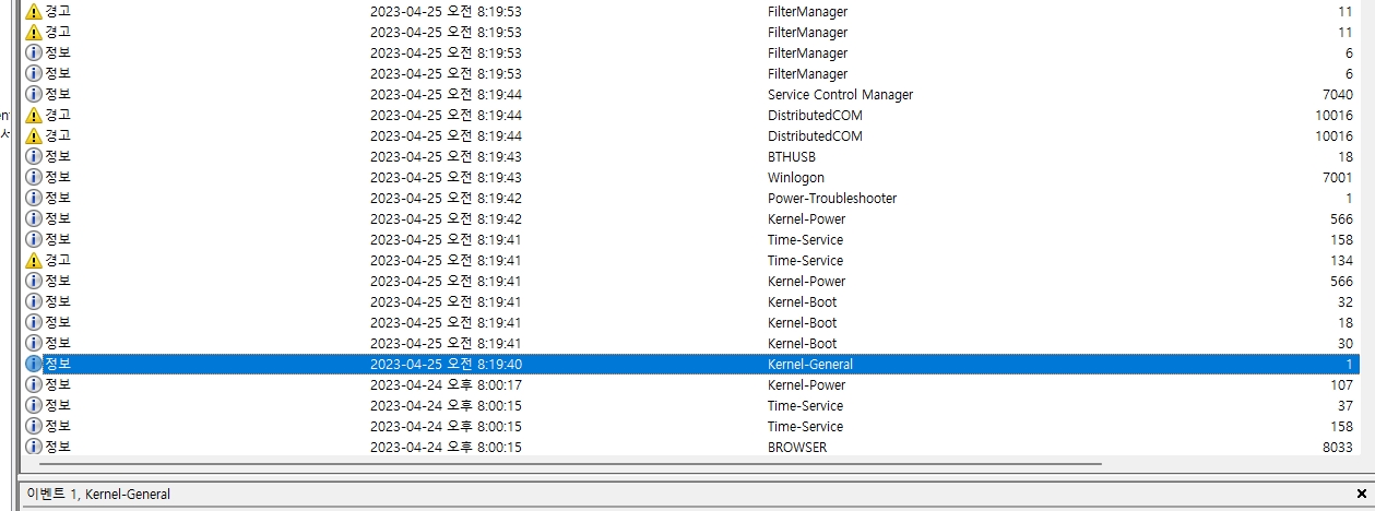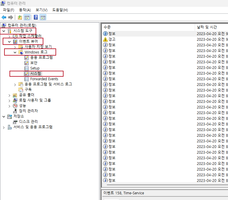 컴퓨터 관리 > 시스템 도구 > 이벤트 뷰어 > Windows 로그 > 시스템