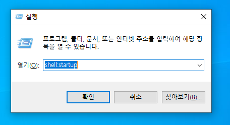 윈도우키 + R 를 누르고, sell:startip을 입력한 다음 확인 버튼을 누른다.